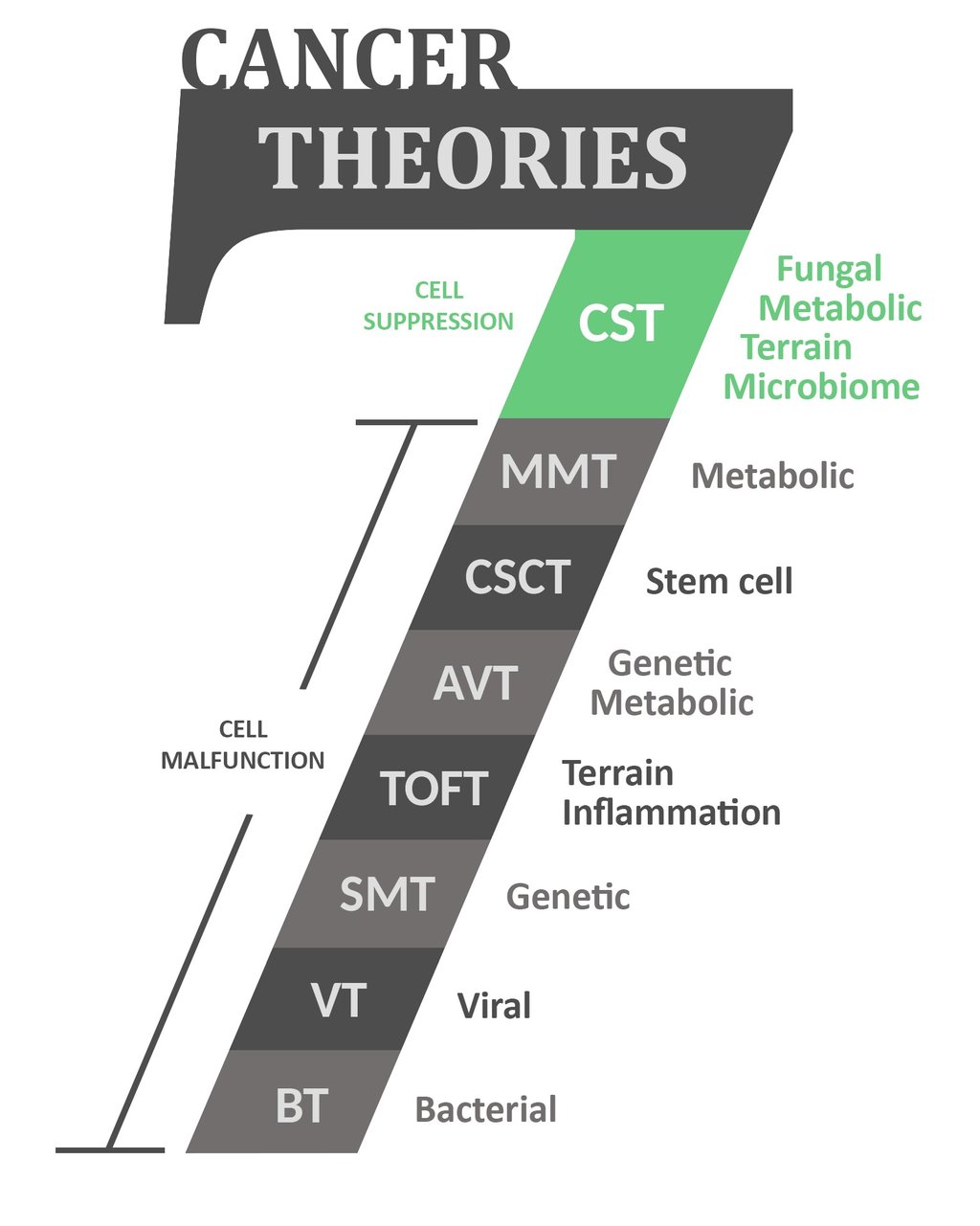 This graphic illustrates the accuracy of each mainstream theory and ultimately why understanding the Cell Suppression Theory will likely benefit your overall survival. Not only does it appear to be the most accurate - indicating it has successfully identified a key driving mechanism to target - it also incorporates the treatments associated with 3 of the other leading theories, supporting a truly holistic approach to cancer care.